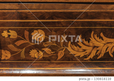 A close-up view of a detailed floral inlay pattern on a wooden furniture
