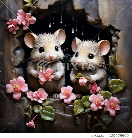 cute mice sitting together in flower blossom petals, mouse couple in love romantic