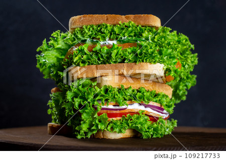 set of sandwiches with fresh salmon, ham, vegetables, salad. Home-made sandwiches. Healthy fast food. Dark background.