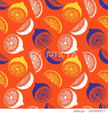 Lemon pattern. Fruit print, yellow and red, summer food background, citrus floral leaf, bright tree wallpaper. Vector seamless illustration texture
