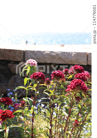 日差しを受けて輝く海辺の赤い花々