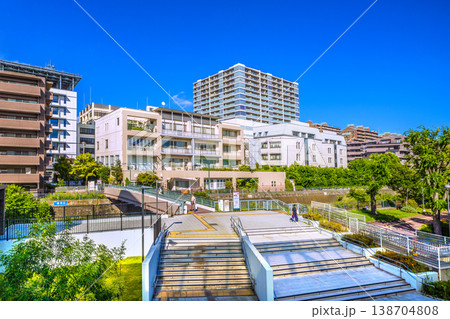 日本の横浜都市景観 センター北駅前の商業施設「ノースポート・モール」などを望む