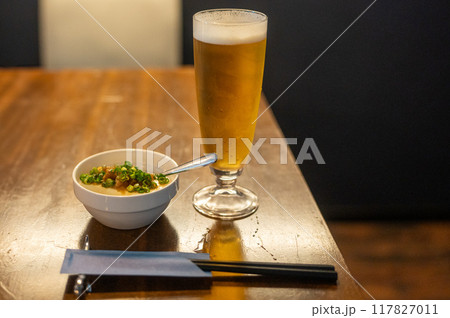 「ビールと冷奴(ひややっこ)」の手書きイラスト(筆書き墨絵風)