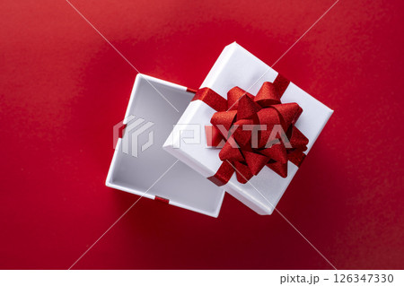 開いたプレゼントボックスと赤い背景の俯瞰
