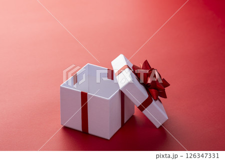 開いたプレゼントボックスと赤い背景
