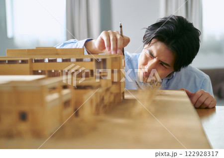 事務所で建築模型を作る一級建築士の資格を持った1人の日本人の男性
