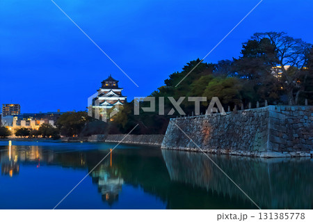 【広島県】内堀から見るライトアップされた広島城の夜景(本丸と天守)