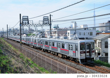 スカイツリーを望む東京の下町を走る東武鉄道10030型電車