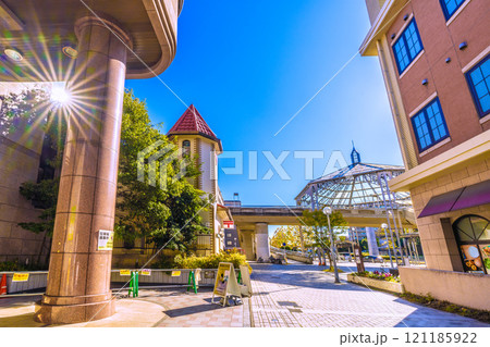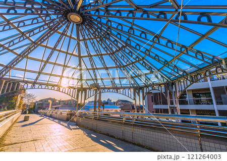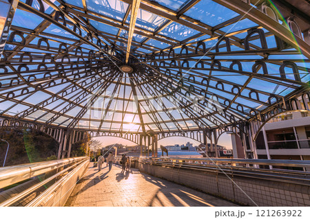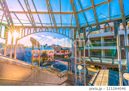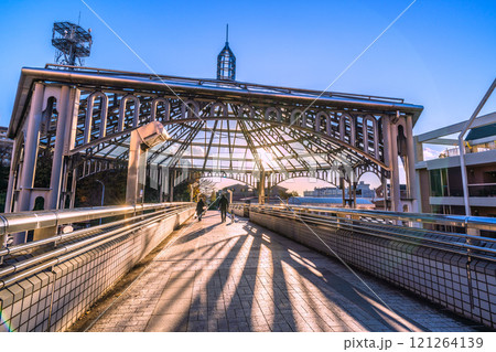 日本の横浜都市景観 年の瀬…横浜市営地下鉄 中川駅など望む。歩道橋に降りそそぐ太陽光…=16日