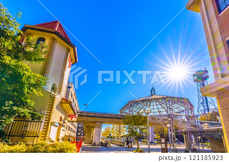 日本の横浜都市景観 年の瀬…横浜市営地下鉄 中川駅などを望む。夕日に照らされる幸福の形…新時代へ