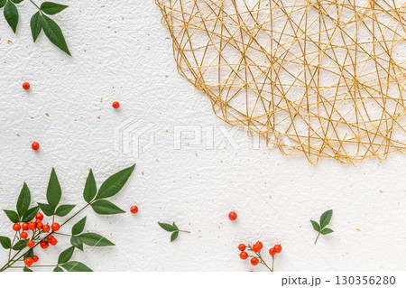 白い和紙に南天と金の水引細工の背景