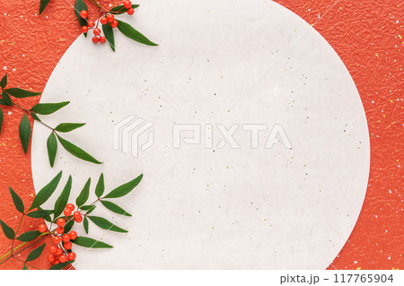 紅白の和紙に南天の葉と万両の赤い実の和風背景