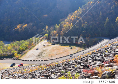 ロックフィルダムの石積堰堤と錦秋の山肌