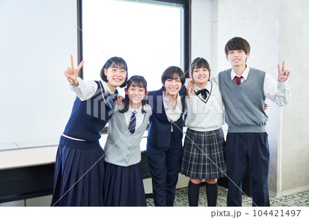 先生と記念写真を撮る中学生