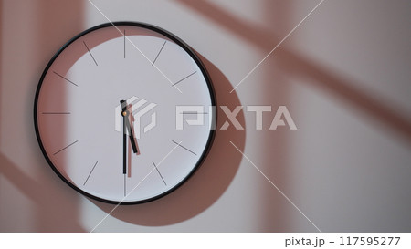 Elegant Black Clock Showing 17.30/05.30 with Shadows on Minimalist Wall - Ideal for Time Management and Interior Design Promotions