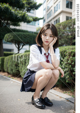 道端に座る制服姿の女子高生 AI画像 AI写真