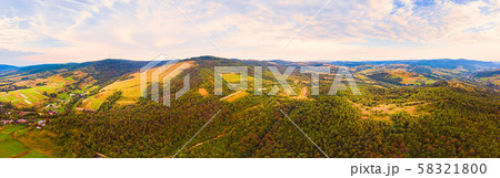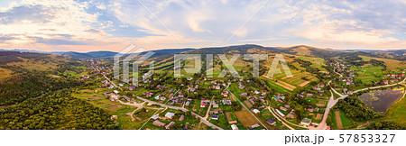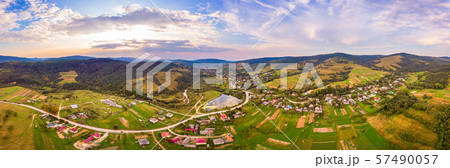 Aerial drone view of urban village Pidbuzh in Carpathians, Ukraine. 180 degrees panoramic landscape