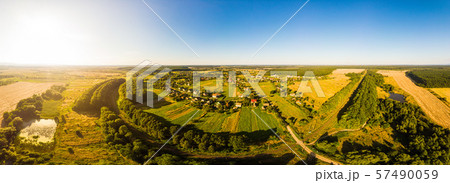 Aerial drone view of traditional Ukrainian village. 180 degrees panoramic landscape of countryside