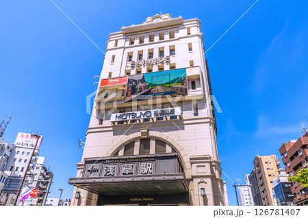 日本の東京都市景観 5月。浅草駅などを望む。(観光客で賑わう浅草)…1929年日光線開業…