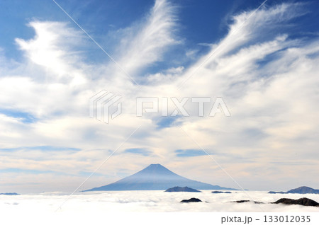 山梨県大月市雁ヶ腹摺山より暴れん坊の雲と雲海の富士山