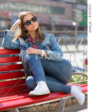 girl in jeans sitting on a bench in the street