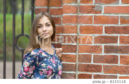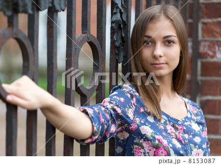 Portrait of a beautiful girl near the old rusty wrought fence