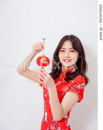 穿著傳統旗袍的年輕亞洲女性,在白色背景前提著貼著福字春聯的小燈籠。