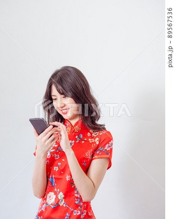 穿著傳統旗袍的年輕亞洲女性,在白色背景前使用智慧型手機。