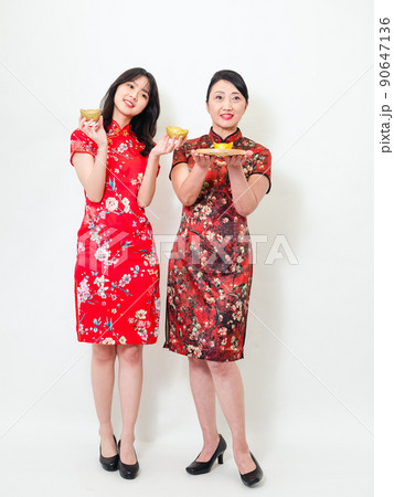 穿著傳統旗袍的年輕及資深亞洲女性,在白色背景前拿一堆的金元寶及金幣,象徵財源廣進。
