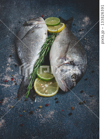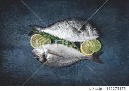 fresh raw dorado fish, on a dark blue background, top view, two pieces, no people,