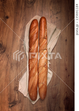 fresh French baguette, two pieces, top view, on the table, no people,