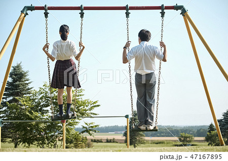 ブランコで遊ぶ兄妹(10歳と5歳)