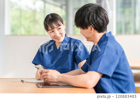 スマホを見ながら会話する先輩看護師と若い男性看護師
