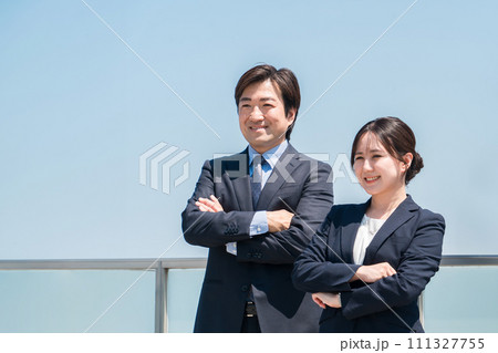 就職・転職・リクルート・青空の中に立つスーツ姿の男女・ビジネスマンとビジネスウーマン(腕組み・自信)