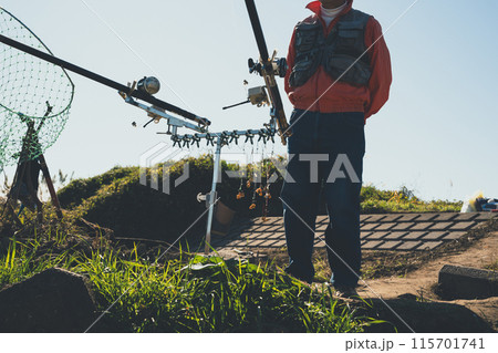 渓流釣りイメージ 釣竿を2本持つ男性手元