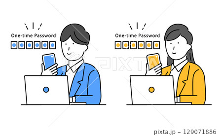 スマホでワンタイムパスワードを受け取った男性と女性のイラスト