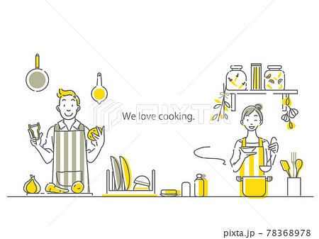 お洒落なキッチンで料理を楽しむ夫婦 シンプルでおしゃれな線画