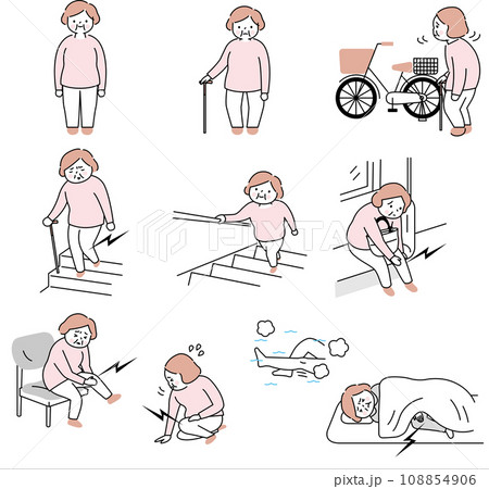 変形性膝関節症の高齢女性いろいろな症状やポーズ