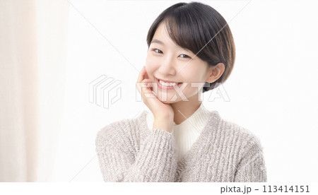 ショートヘアの東洋人の若い女性が頬に手を当てている様子