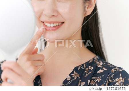 鏡で歯をチェックする女性