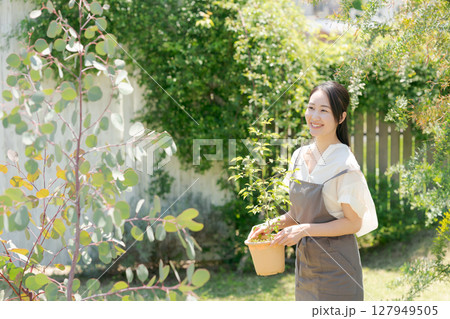 鉢植えを持つ女性