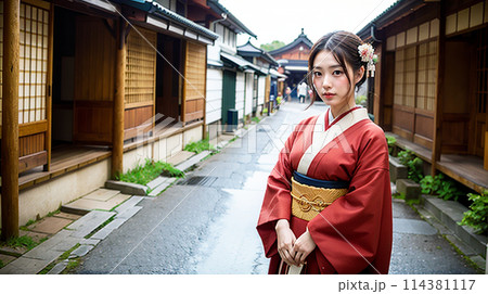 日本の古い町並みを背景に立つ着物姿の女性