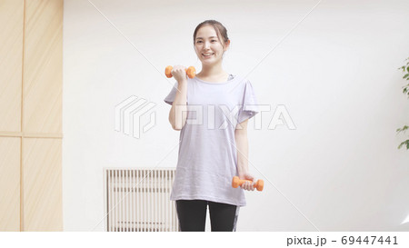 ダンベルで筋トレをする若い女性