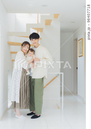 玄関 庭 お出かけする親子