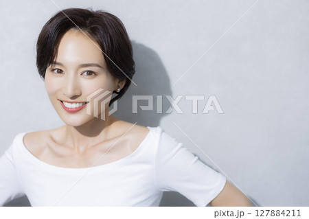 夏をイメージした白バックの若い女性のポートレート