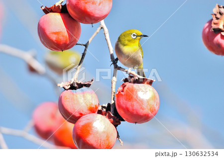 熟した柿の実をつけた柿木の枝で実を啄むメジロ