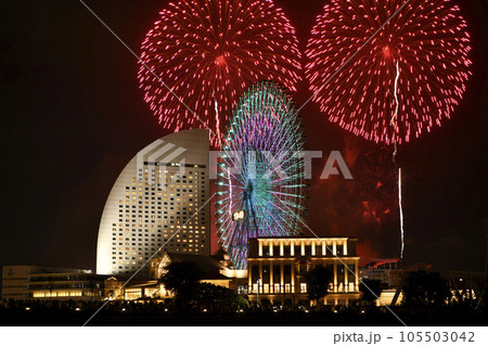 日本の横浜都市景観 2023・「みなとみらいスマートフェスティバル2023」。横浜の夜空を彩る2万発