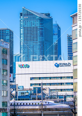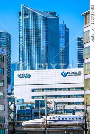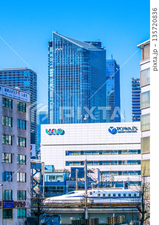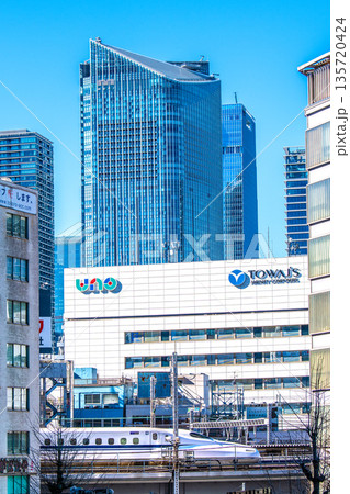 日本の東京都市景観新風景。虎ノ門ヒルズや新橋を走る新幹線、東和フードサービスなどを望む=1月23日