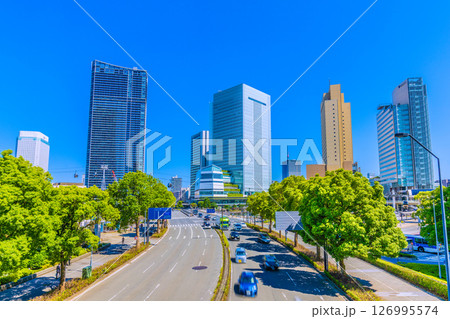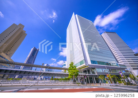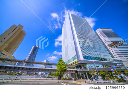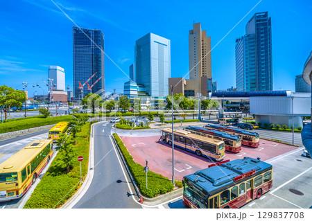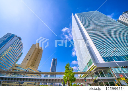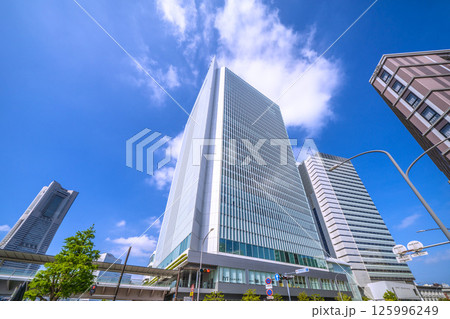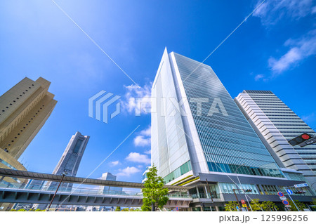 日本の横浜都市景観 桜木町駅前・横浜市役所や横浜ランドマークタワーなどビル群を望む