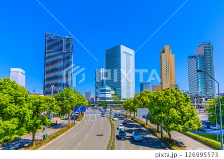 日本の東京都市景観 桜木町駅前のビル群や横浜市役所などを望む